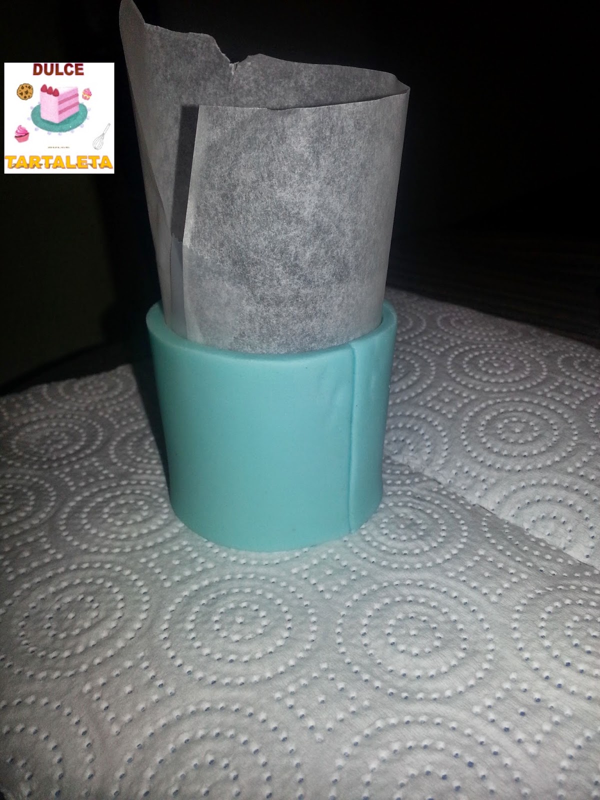 3º. Envolvemos el vaso que forramos con papel de horno en paso a con la pieza de fondant rectangular del paso 2. Pegamos los extremos con un poco de pegamento comestible, agua o royal icing del mismo color para que pegue antes. Yo lo pegué con pegamento comestible y quedó muy bien.